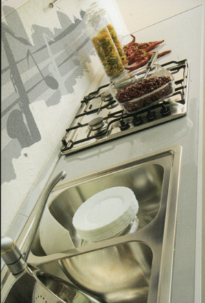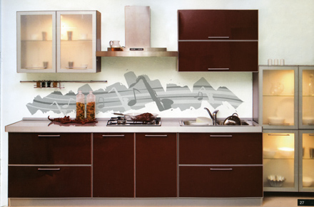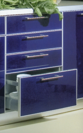 Фасад МДФ толщиной 4 мм с высокоглянцевым покрытием полиуретановой эмалью, в алюминиевой рамке толщиной 22 мм. В данной модели отсутствуют элементы с гнутыми фасадами. Более 600 вариантов цвета.