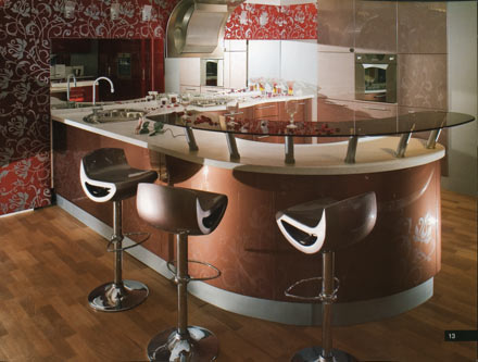 Для данной модели характерны изогнутые формы, чередование вогнутых и выпуклых поверхностей. Фасады МДФ толщиной 18 мм и с характерным скосом покрыты высокоглянцевой полиуретановой эмалью итальянского производства. По желанию заказчика на фасадные элементы наносится растительный орнамент. Более 600 вариантов цвета.