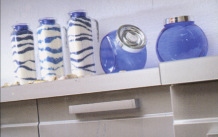 На фасадах из МДФ 16 мм с отделкой полиуретановыми шелковисто-матовыми или высокоглянцевыми эмалями наносится стильный горизонтальный рисунок. Особенностью данного рисунка является фрезерование широкой горизонтальной полосы шириной 68,5 мм. Большой выбор цветов эмали, характерные элементы из алюминия и акрила позволяют создавать каждый раз новые композиции и интересные проекты. В данной модели отсутствуют элементы с гнутыми фасадами. Фасадные элементы с нанесением рисунка могут комплектоваться стеклом «скрин».
