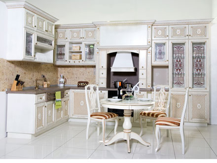 Фасады: массив сосны, с диагональной фрезеровкой с добавлением декора Столешница: искусственный камень с влитой мойкой Пристеночный плинтус: алюминиевый Стекло с нанесением рисунка