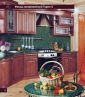 Аккуратный рамочный фасад органично дополняется стеклянными дверцами, а интересные скрытые полочки разнообразят оформление кухни. Все шкафы очень вместительные, ничто не будет загромождать столешницу. Посуда прячется в нишу над раковиной, кастрюли и сковородки в нижние шкафчики. Есть ящики для круп, полки для приправ и еще масса дополнительных отсеков.